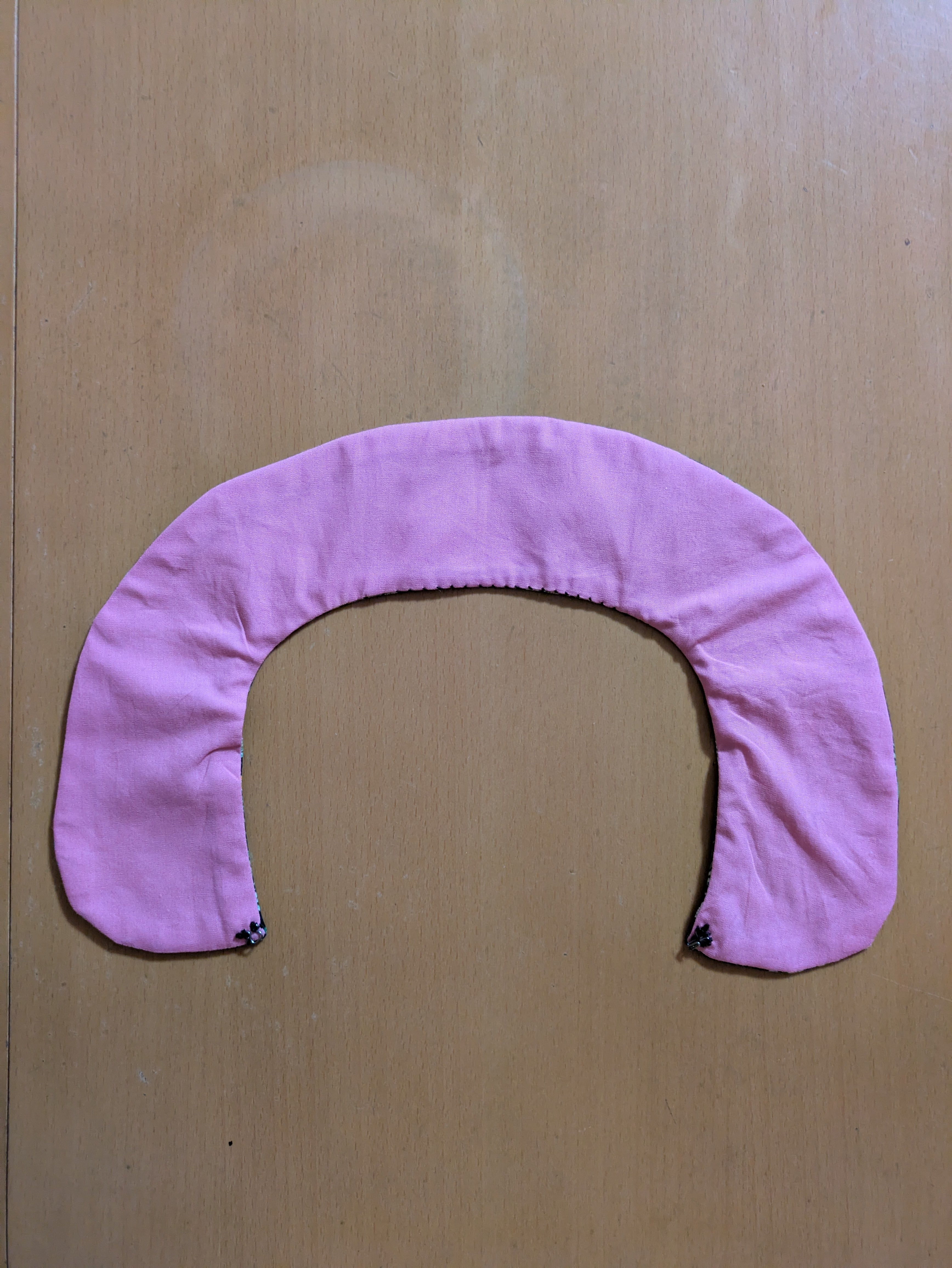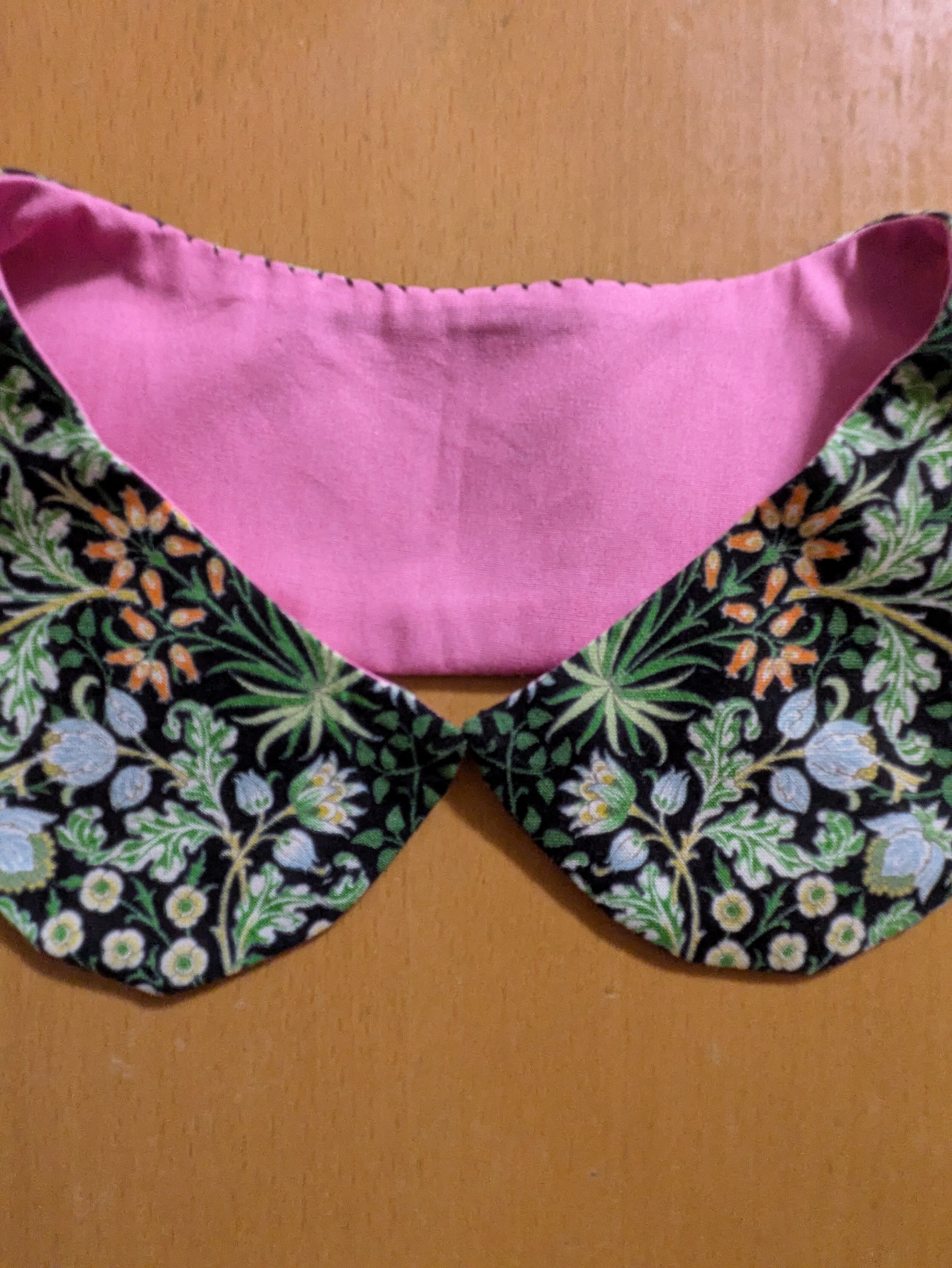 ピンクと花柄のスカラップエッジデザインで、カジュアルなスタイルに最適なコットンのつけ襟。巾着と2点セットで1200円、単品ですと巾着700円、つけ襟800円です。