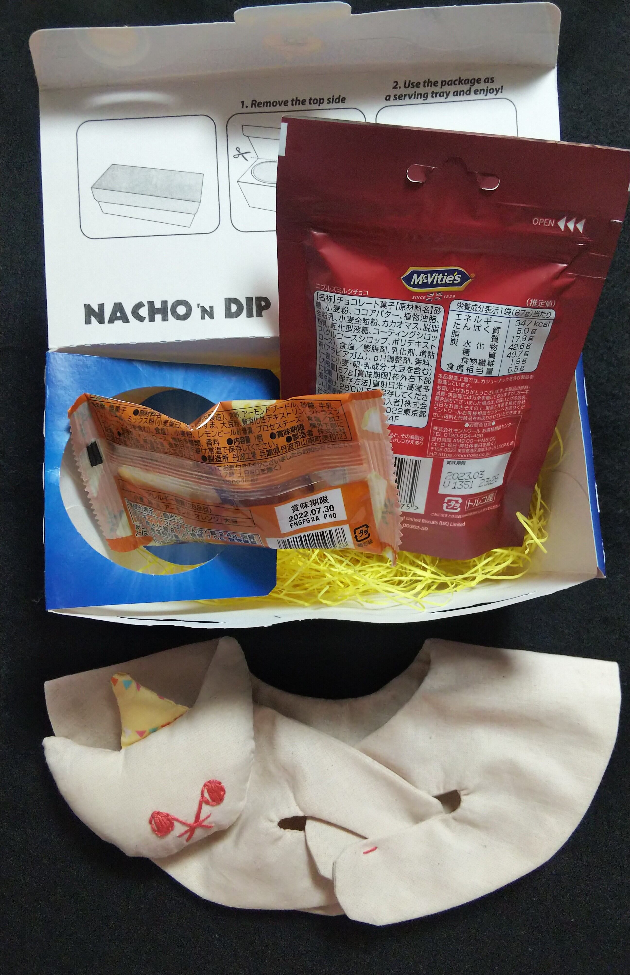 このページのお品の金額は、スタイ1枚=2200円、市販のおやつや送料を含め、トータル2700円です。