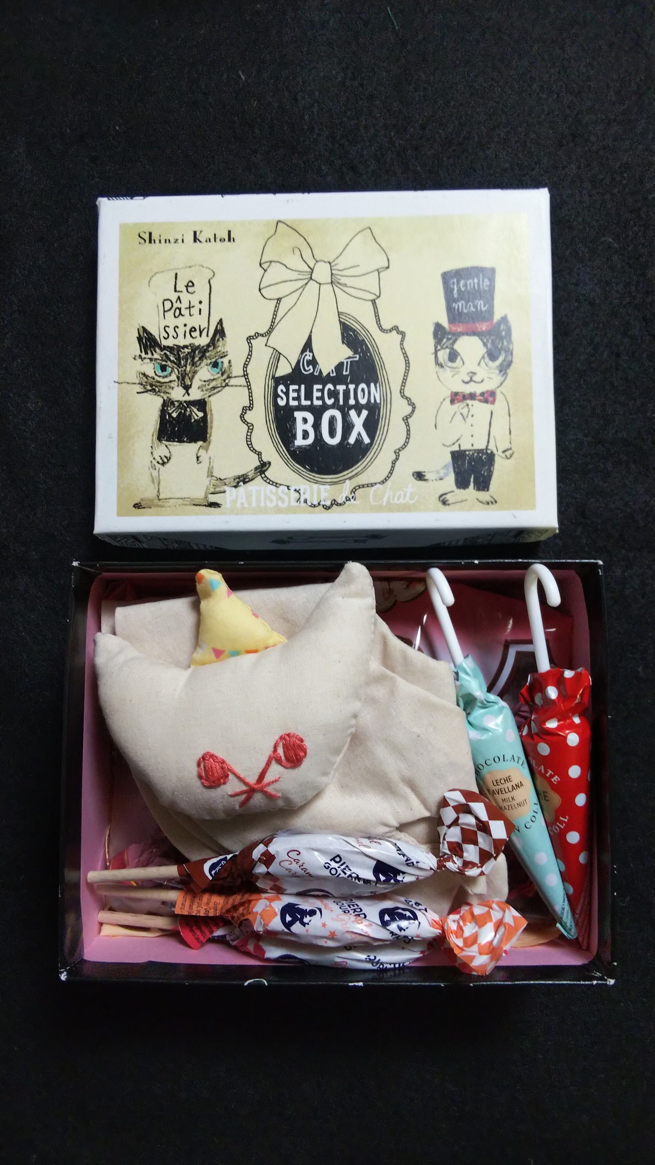 猫のパティシエのお菓子の空き箱が、素敵だったので、こちらに詰めてラッピングのうえ、お送りします。